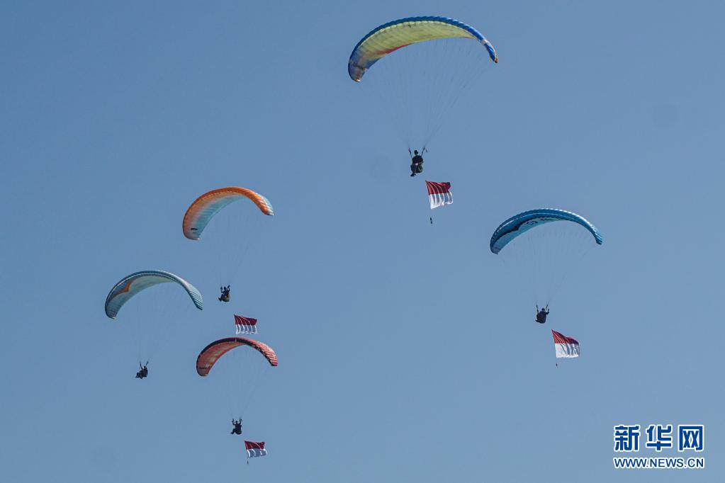 8月17日,懸掛印度尼西亞國旗的滑翔傘飛過巴厘島上空。8月17日是印度尼西亞獨(dú)立日。新華社發(fā)(比辛拉西攝)