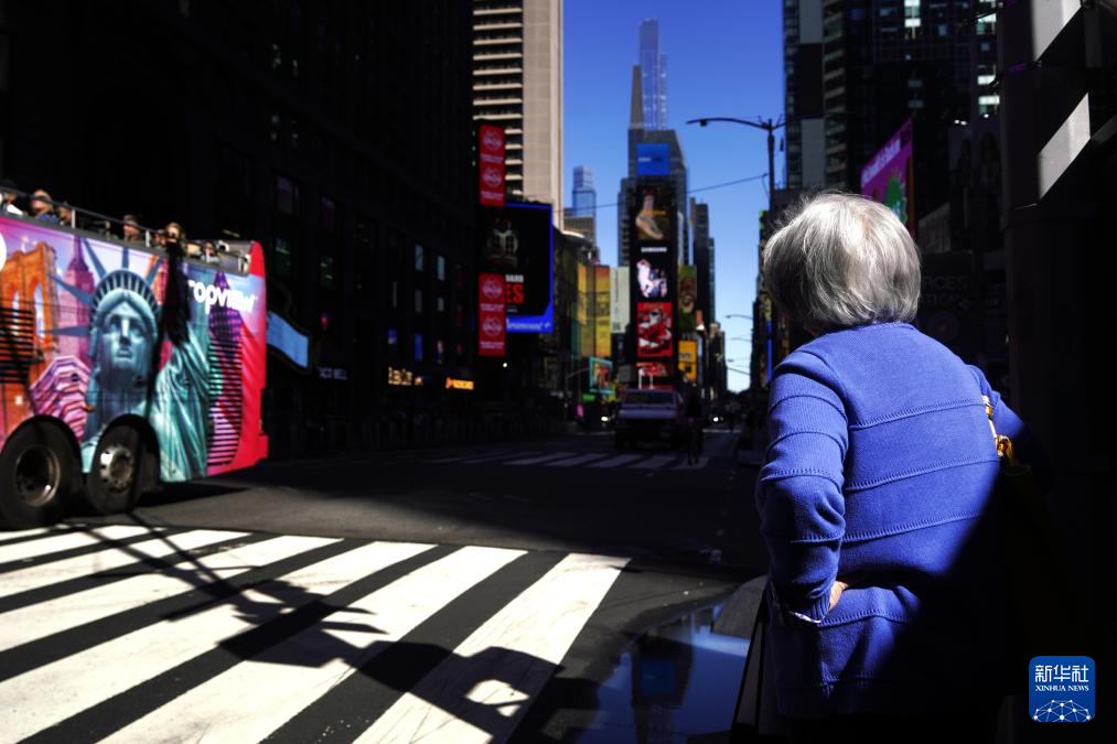 10月1日,在美国纽约曼哈顿的时报广场附近,行人等待过马路。