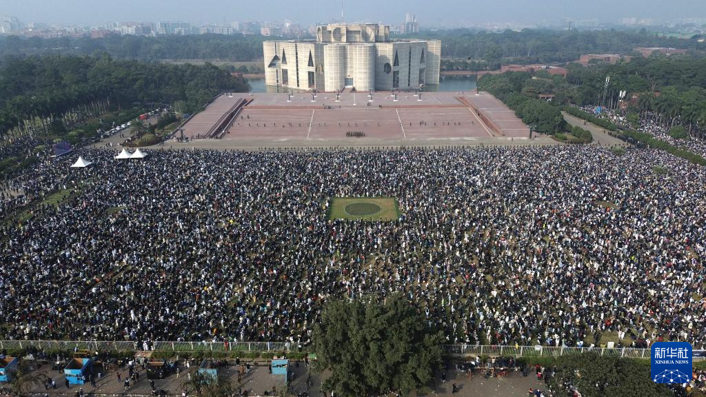 2025年12月31日,人们在孟加拉国首都达卡的国会大厦附近参加卡莉达·齐亚的葬礼(无人机照片)。