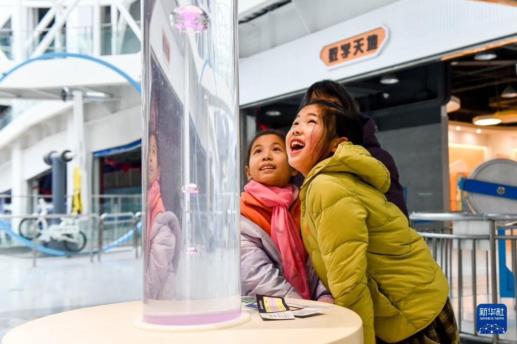 2月6日,小朋友在江苏泰州科技馆体验科学实验装置。