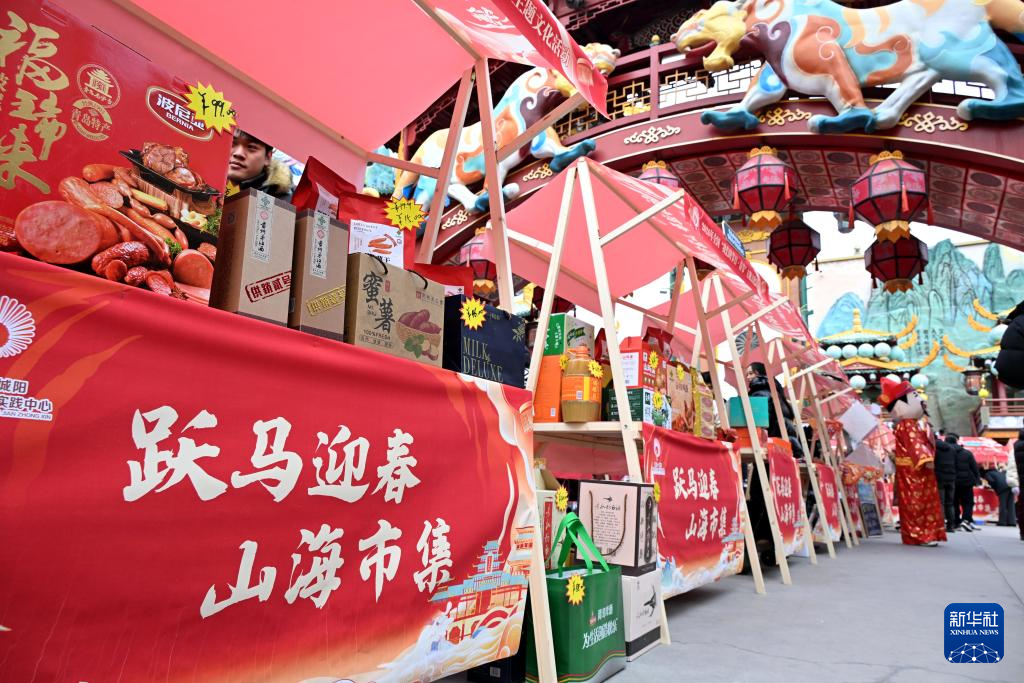 青岛市城阳区山海间不夜城主题街区设置非遗大集,集中展示名优特产、非遗民俗、地方风味等(2月10日摄)。