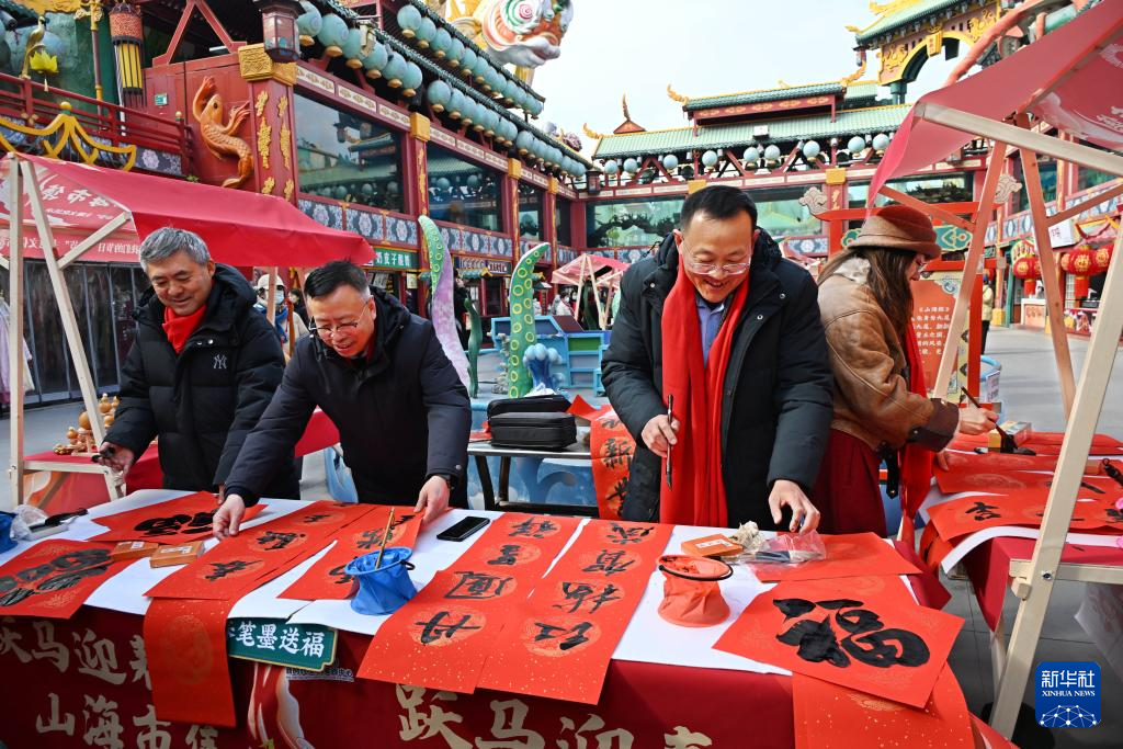 2月10日,在青岛市城阳区山海间不夜城主题街区,书法家在活动现场写对联、送福字。