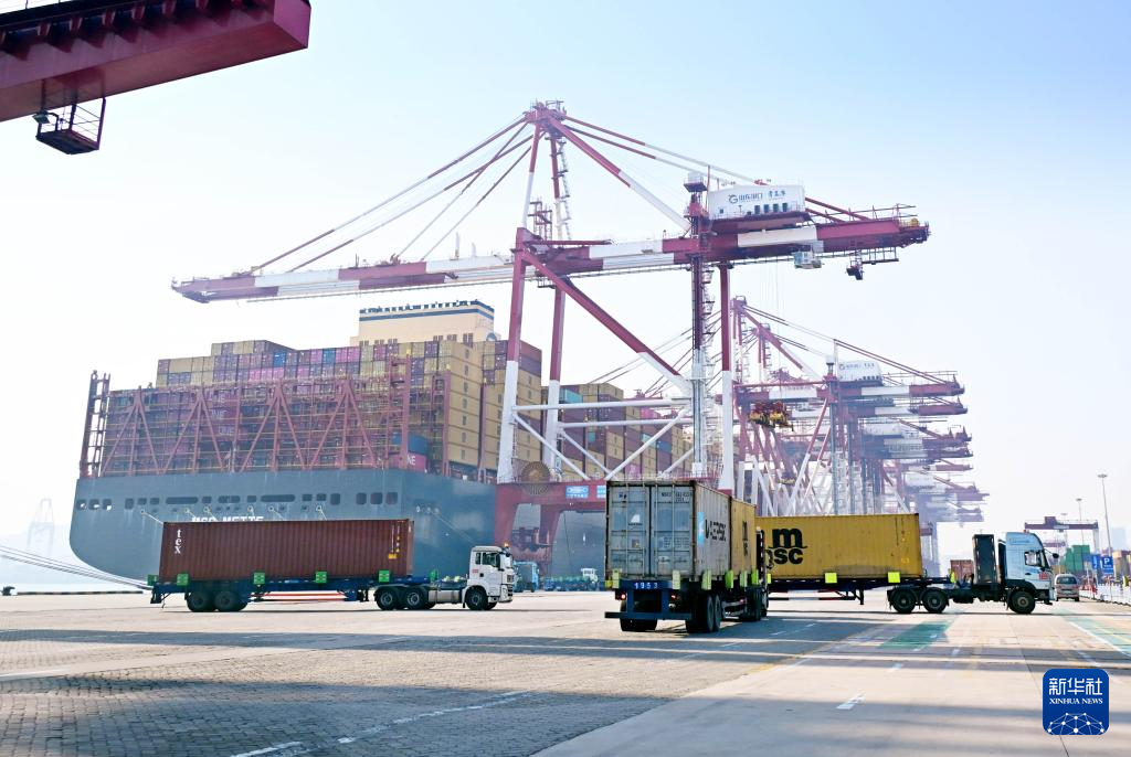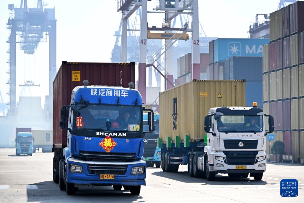 2月18日,卡车在青岛港前湾集装箱码头运送集装箱。