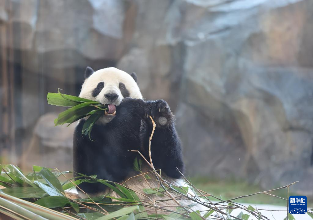 2月19日,大熊猫“德瑞”在吃新鲜竹子。