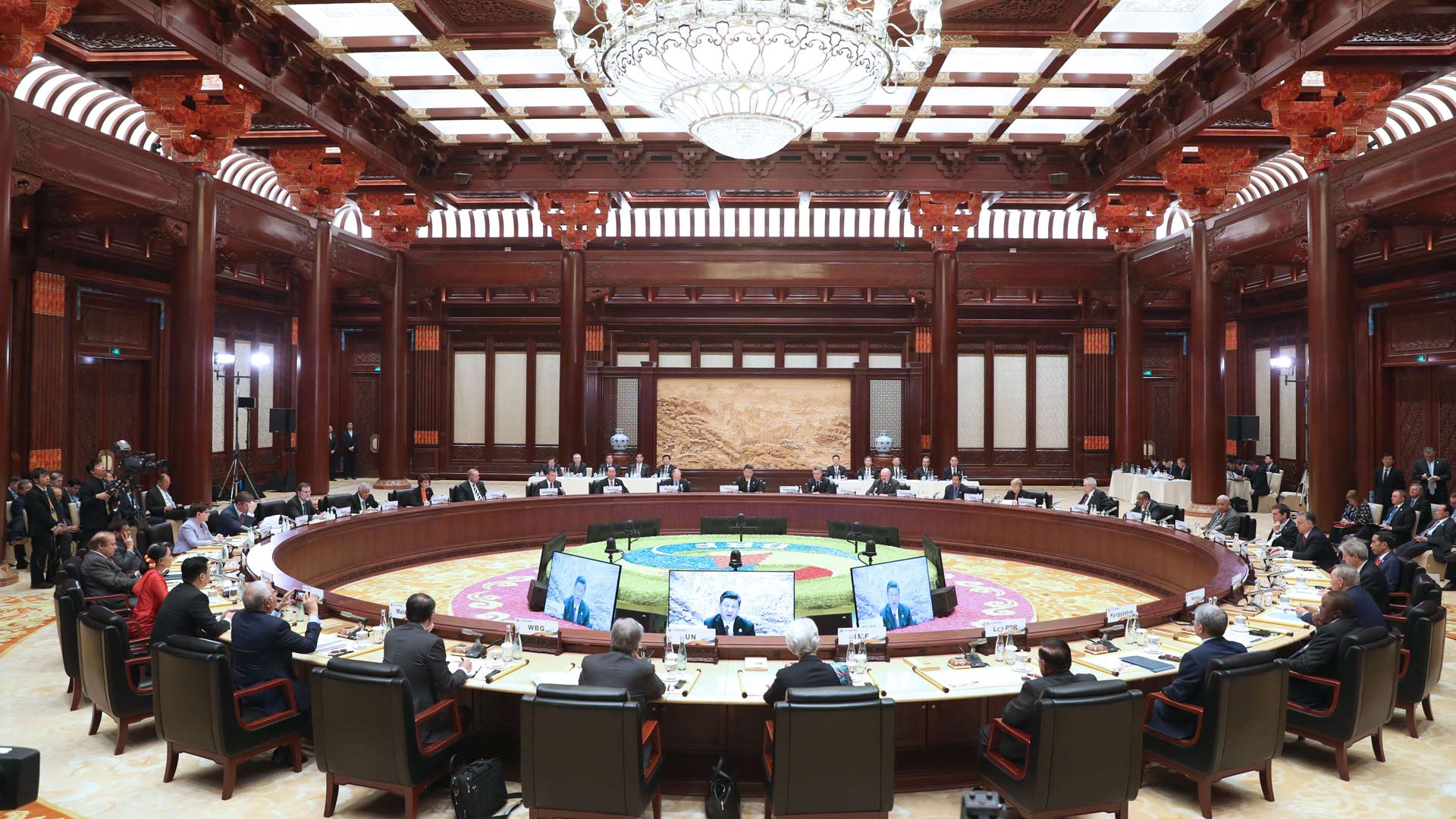 5月15日,“一帶一路”國(guó)際合作高峰論壇圓桌峰會(huì)在北京雁棲湖國(guó)際會(huì)議中心舉行,國(guó)家主席習(xí)近平主持會(huì)議并致開(kāi)幕辭。這是第一階段會(huì)議結(jié)束后,習(xí)近平同外方代表團(tuán)團(tuán)長(zhǎng)及嘉賓步出雁棲湖國(guó)際會(huì)議中心。新華社記者 饒愛(ài)民 攝