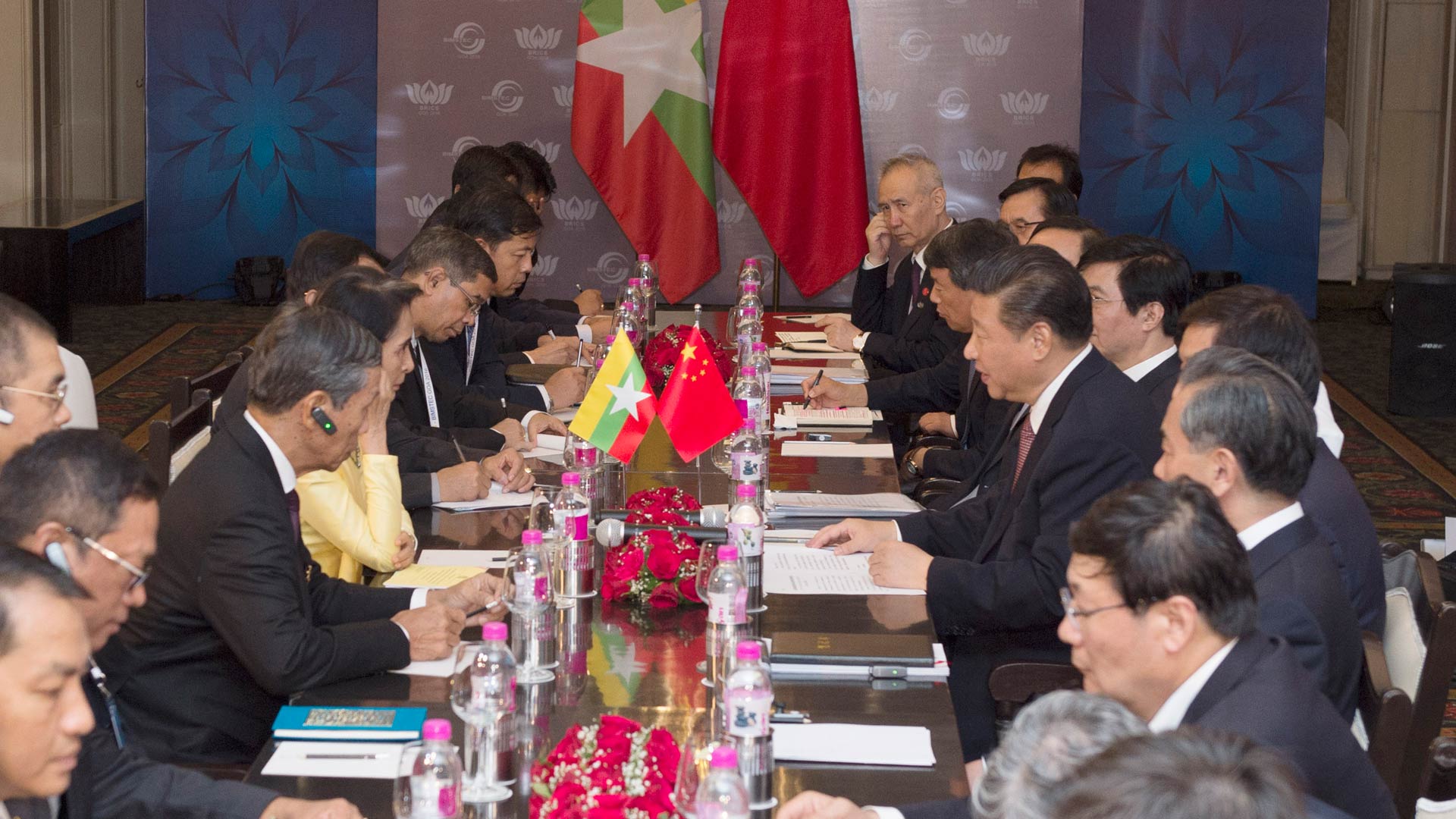 10月16日,國家主席習(xí)近平在印度果阿會見緬甸國務(wù)資政昂山素季。 新華社記者 王曄 攝