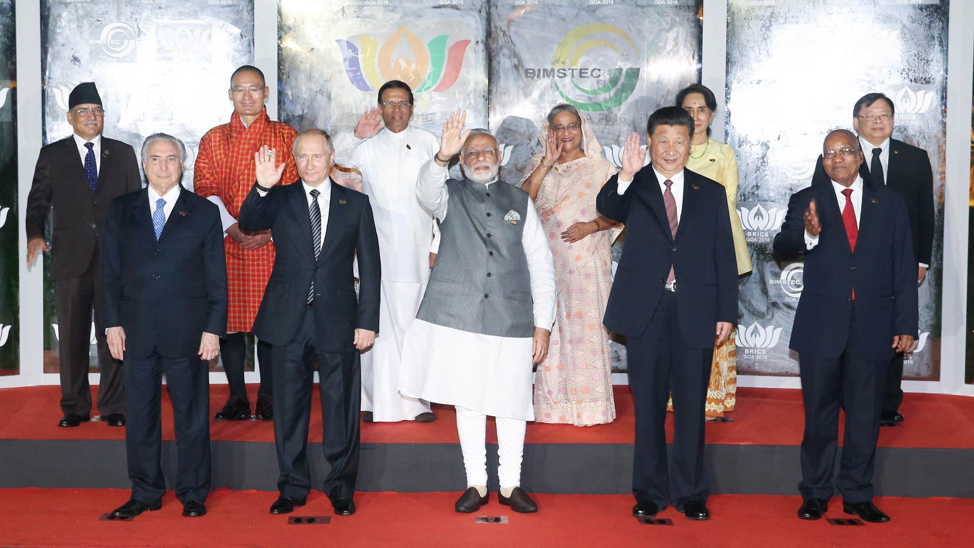 10月16日,金磚國家領(lǐng)導(dǎo)人同“環(huán)孟加拉灣多領(lǐng)域經(jīng)濟技術(shù)合作倡議”成員國領(lǐng)導(dǎo)人對話會在印度果阿舉行。國家主席習(xí)近平同印度總理莫迪、南非總統(tǒng)祖馬、巴西總統(tǒng)特梅爾、俄羅斯總統(tǒng)普京以及斯里蘭卡總統(tǒng)西里塞納、孟加拉國總理哈西娜、不丹首相托杰、尼泊爾總理普拉昌達、緬甸國務(wù)資政昂山素季、泰國政府代表等共同出席。這是與會領(lǐng)導(dǎo)人合影。新華社記者 姚大偉 攝
