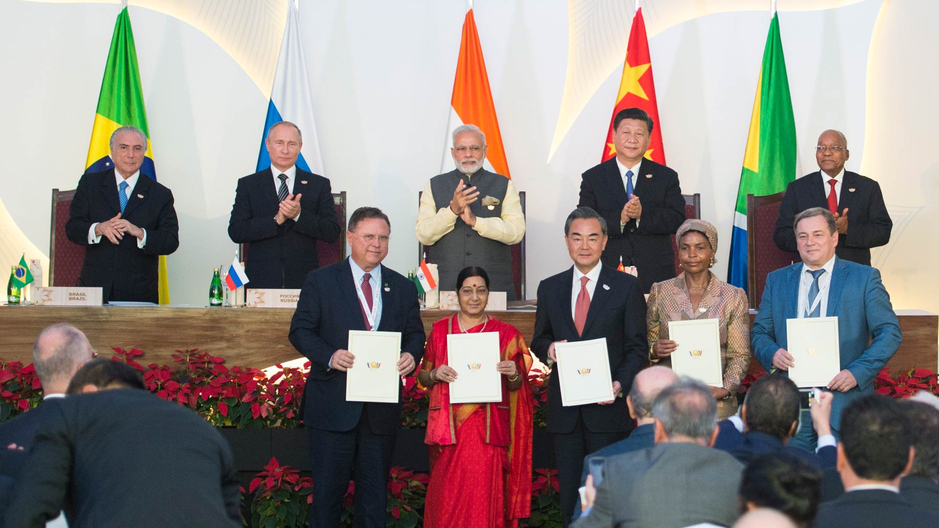 10月16日,金磚國家領(lǐng)導(dǎo)人第八次會晤在印度果阿舉行。中國國家主席習(xí)近平、印度總理莫迪、南非總統(tǒng)祖馬、巴西總統(tǒng)特梅爾、俄羅斯總統(tǒng)普京出席。這是會晤結(jié)束后,5國領(lǐng)導(dǎo)人共同見證合作文件的簽署,并出席聯(lián)合記者會。新華社記者 謝環(huán)馳 攝