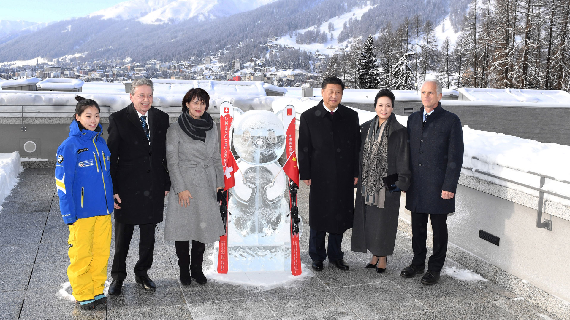 1月17日,國(guó)家主席習(xí)近平同瑞士聯(lián)邦主席洛伊特哈德在達(dá)沃斯共同啟動(dòng)中瑞旅游年。兩國(guó)元首夫婦等在熊貓冰雕像和印有中瑞兩國(guó)國(guó)旗及“中瑞旅游年”字樣的滑雪板旁合影留念。新華社記者 饒愛(ài)民 攝2017-01-18