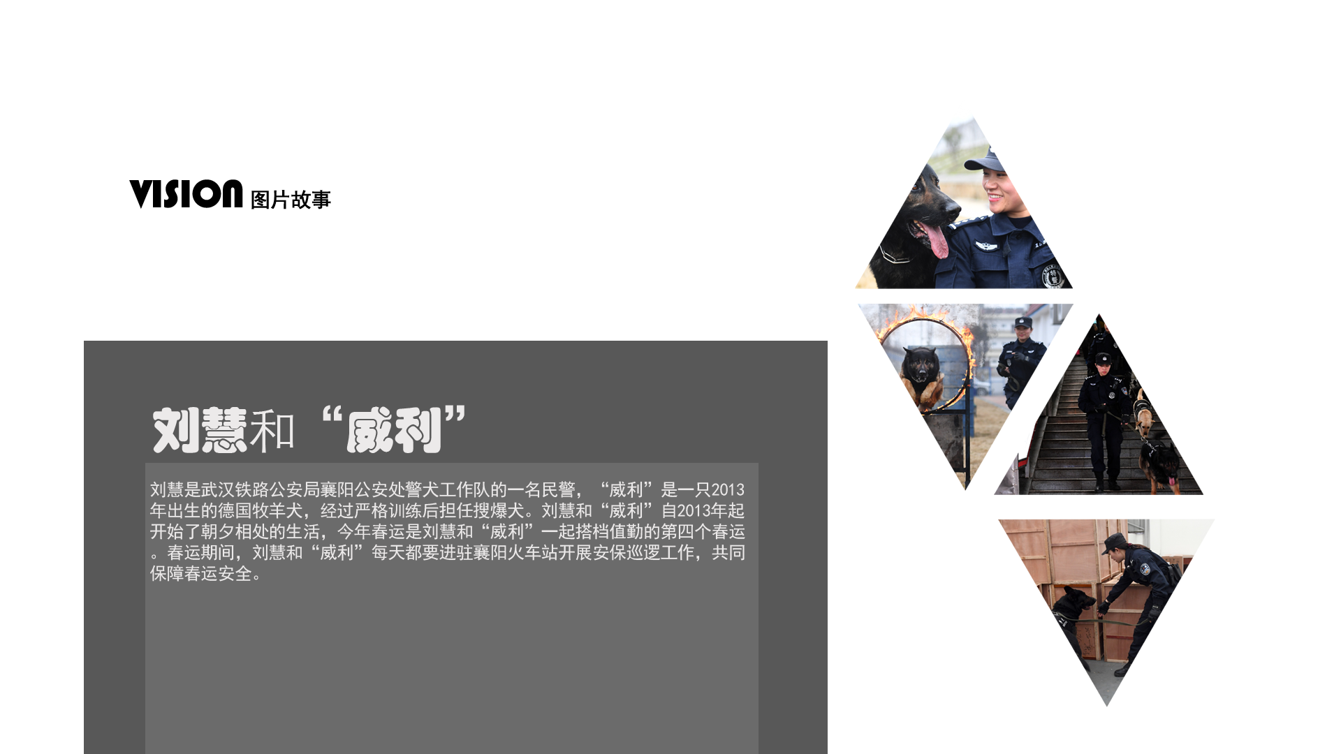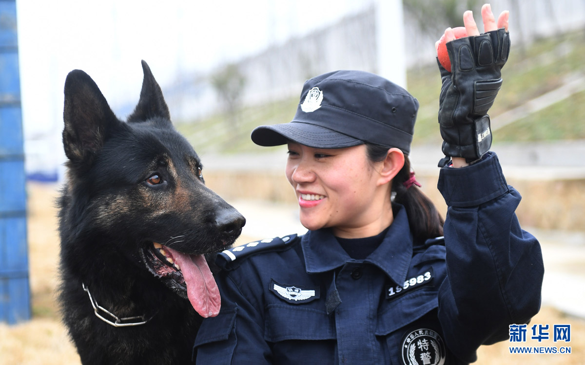 2月5日,劉慧和“威利”在警犬基地玩耍。劉慧是武漢鐵路公安局襄陽(yáng)公安處警犬工作隊(duì)的一名民警,“威利”是一只2013年出生的德國(guó)牧羊犬,經(jīng)過(guò)嚴(yán)格訓(xùn)練后擔(dān)任搜爆犬。劉慧和“威利”自2013年起開(kāi)始了朝夕相處的生活,今年春運(yùn)是劉慧和“威利”一起搭檔值勤的第四個(gè)春運(yùn)。春運(yùn)期間,劉慧和“威利”每天都要進(jìn)駐襄陽(yáng)火車(chē)站開(kāi)展安保巡邏工作,共同保障春運(yùn)安全。 新華社記者 程敏 攝