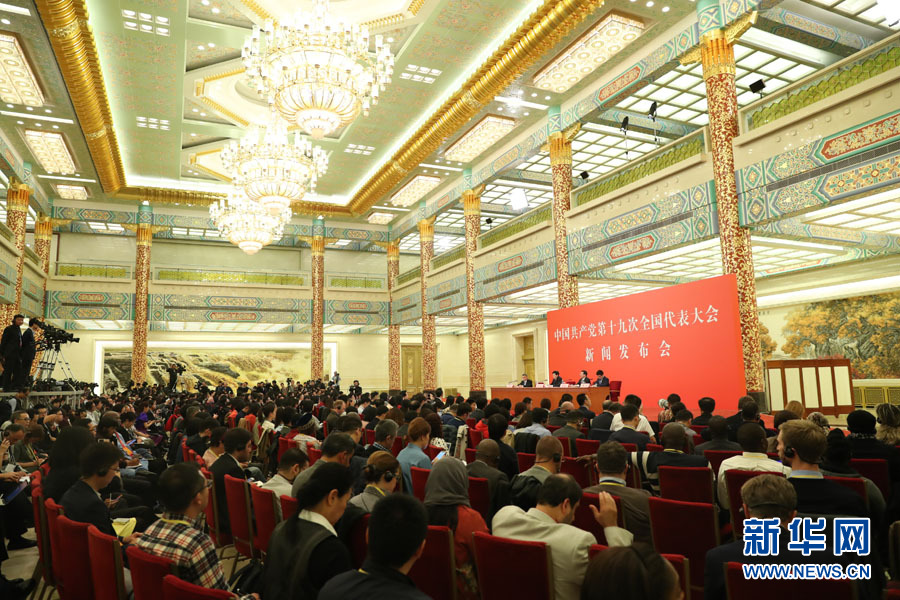 2017年10月17日下午,中國(guó)共產(chǎn)黨第十九次全國(guó)代表大會(huì)新聞發(fā)言人在人民大會(huì)堂三樓金色大廳舉行新聞發(fā)布會(huì),并回答中外記者提問(wèn)。圖為新聞發(fā)布會(huì)現(xiàn)場(chǎng)。新華網(wǎng) 翟子赫 攝