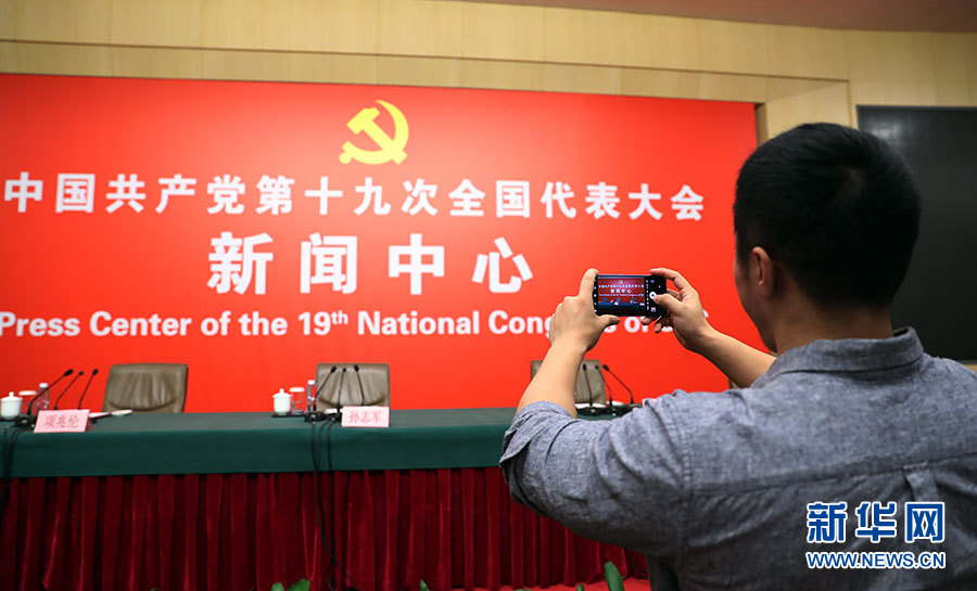 ??? 10月20日,十九大新聞中心舉行記者會,邀請中宣部、中央文明辦、文化部、新聞出版廣電總局相關(guān)負(fù)責(zé)人介紹加強思想道德和文化建設(shè)情況,并回答記者提問。圖為記者在現(xiàn)場拍攝。新華網(wǎng) 郝廣鵬 攝