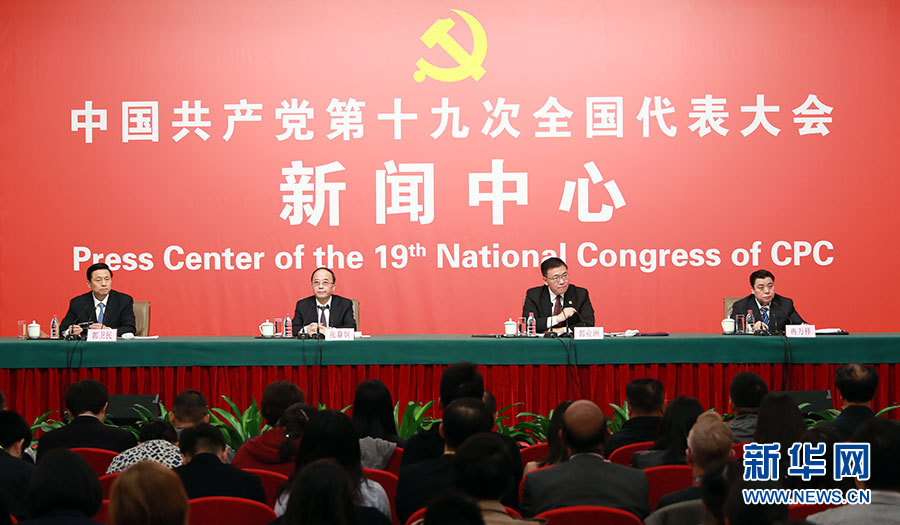 10月21日,十九大新聞中心舉辦記者招待會,邀請中共中央統(tǒng)戰(zhàn)部常務副部長張裔炯、副部長冉萬祥,中共中央對外聯(lián)絡部副部長郭業(yè)洲介紹黨的統(tǒng)一戰(zhàn)線工作和黨的對外交往情況,并回答記者提問。圖為記者招待會現(xiàn)場。新華網(wǎng) 郝廣鵬攝
