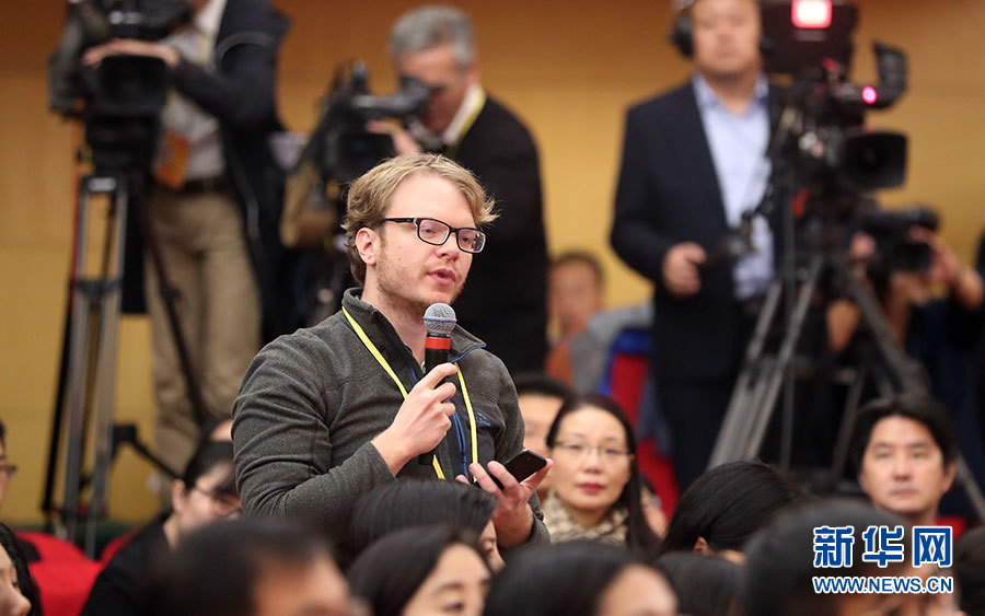 ??? 10月21日,十九大新聞中心舉辦記者招待會(huì),邀請(qǐng)中共中央統(tǒng)戰(zhàn)部常務(wù)副部長張裔炯、副部長冉萬祥,中共中央對(duì)外聯(lián)絡(luò)部副部長郭業(yè)洲介紹黨的統(tǒng)一戰(zhàn)線工作和黨的對(duì)外交往情況,并回答記者提問。圖為彭博新聞社記者提問。新華網(wǎng) 郝廣鵬攝