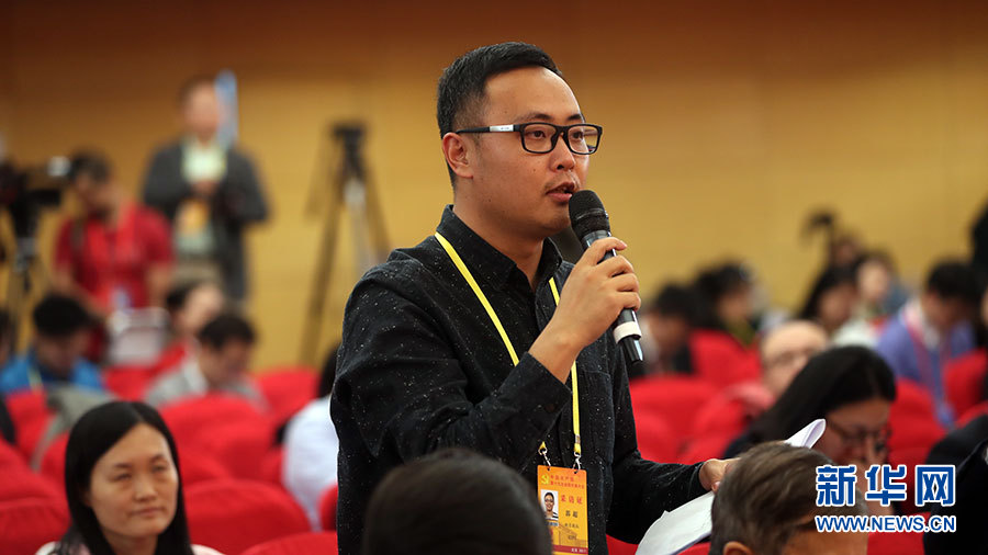 10月22日,十九大新聞中心在梅地亞中心二層新聞發(fā)布廳舉辦集體采訪活動(dòng),邀請(qǐng)教育領(lǐng)域代表談“教育綜合改革”。圖為新京報(bào)記者提問(wèn)。新華網(wǎng) 郝廣鵬攝