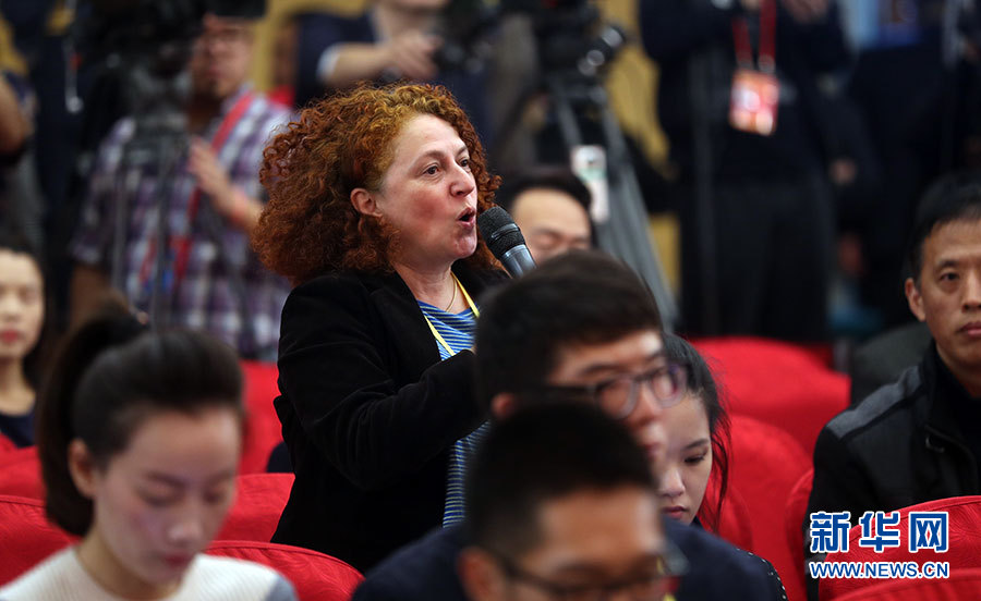 10月22日,十九大新聞中心在梅地亞中心二層新聞發(fā)布廳舉辦集體采訪活動,主題為“中國特色強軍之路邁出堅定步伐”。圖為意大利24小時太陽報記者提問。新華網 郝廣鵬攝
