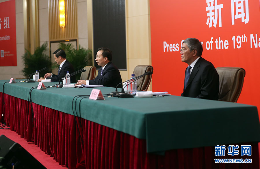 10月23日,十九大新聞中心舉辦記者招待會(huì),邀請中央財(cái)經(jīng)領(lǐng)導(dǎo)小組辦公室副主任楊偉民,環(huán)境保護(hù)部黨組書記、部長李干杰介紹踐行綠色發(fā)展理念,建設(shè)美麗中國有關(guān)情況,并回答記者提問。圖為記者招待會(huì)現(xiàn)場。新華網(wǎng) 郝廣鵬攝
