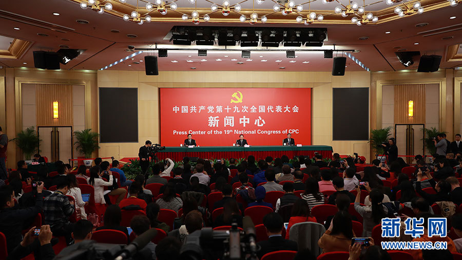 10月23日,十九大新聞中心舉辦記者招待會,邀請中央財經領導小組辦公室副主任楊偉民,環(huán)境保護部黨組書記、部長李干杰介紹踐行綠色發(fā)展理念,建設美麗中國有關情況,并回答記者提問。圖為記者招待會現場。新華網 郝廣鵬攝