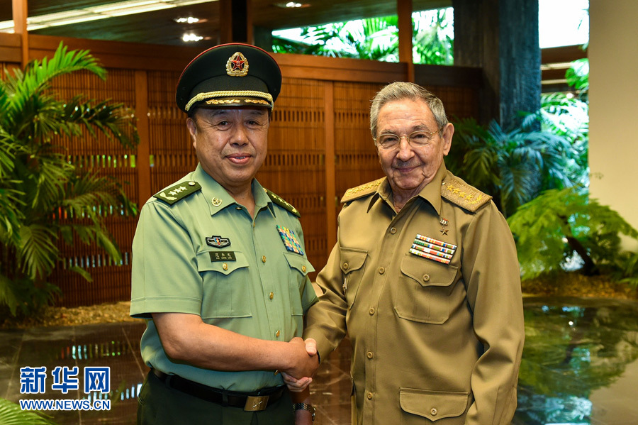 ?? 6月15日,古巴國務委員會主席兼部長會議主席勞爾·卡斯特羅(右)在首都哈瓦那會見正在古巴訪問的中央軍委副主席范長龍。 新華社發(fā)
