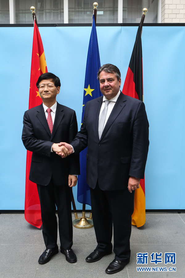 ?? ?6月29日,習(xí)近平主席特使、中共中央政治局委員、中央政法委書記孟建柱(左)在德國首都柏林會(huì)見德國副總理兼經(jīng)濟(jì)和能源部長加布里爾。新華社記者張帆攝