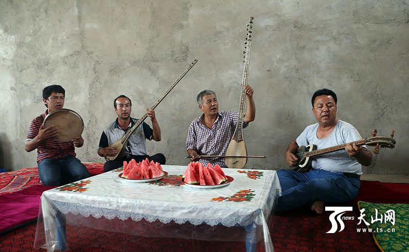 2013年以來,鄯善縣拿出資金,在全縣每個(gè)自然村建立農(nóng)民“文化大院”,給農(nóng)民提供文化娛樂的場(chǎng)所,十二木卡姆也自然成為大院里必備的節(jié)目,老藝人們忙碌了不少。最近正值齋月期間,村民間的文化活動(dòng)照舊開展,蘇來曼 阿不都時(shí)常還要去周圍村里演出,最讓他高興的是,十二木卡姆這門古老的藝術(shù),在今天依舊被大家重視和喜愛,這一點(diǎn)對(duì)于他來說,比金錢更重要?!爸灰蠹疫€喜歡十二木卡姆,在平日里能見到它,它的傳承和發(fā)展就有不竭動(dòng)力。” 蘇來曼 阿不都說。