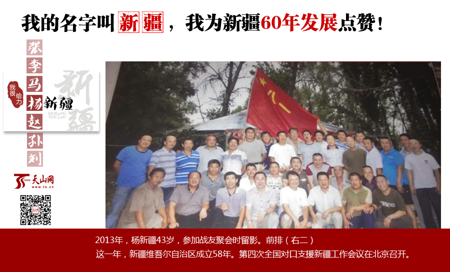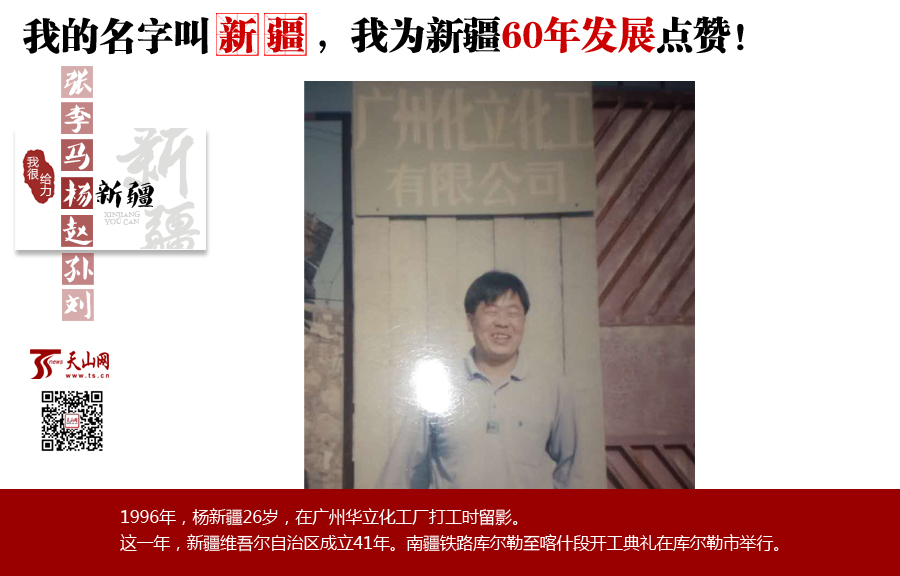 楊新疆:叫這個名字挺自豪,尤其去外地,人家一聽就知道我是新疆人,會主動找我聊天。1996年我去廣州打工,身邊來自全國各地的工友對新疆都很好奇,空閑的時(shí)候,就想聽我說說新疆到底啥樣,我就給大家介紹新疆,這讓我認(rèn)識不少朋友。
