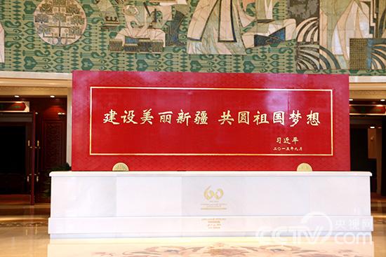 習近平總書記題詞“建設美麗新疆 共圓祖國夢想”的賀匾。