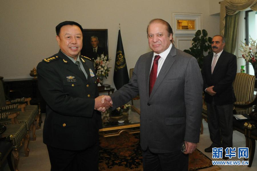 ???? 11月12日,在巴基斯坦首都伊斯蘭堡,中央軍委副主席范長(zhǎng)龍(左)與巴基斯坦總理謝里夫握手。正在巴基斯坦訪問(wèn)的中央軍委副主席范長(zhǎng)龍12日會(huì)見(jiàn)了巴總理謝里夫。 新華社發(fā)(艾哈邁德·卡邁勒攝)