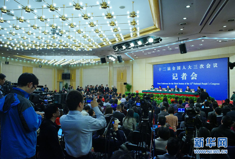 ????十二屆全國(guó)人大三次會(huì)議新聞中心于3月12日在梅地亞中心多功能廳舉行記者會(huì),邀請(qǐng)中國(guó)人民銀行行長(zhǎng)周小川,中國(guó)人民銀行副行長(zhǎng)、國(guó)家外匯管理局局長(zhǎng)易綱,中國(guó)人民銀行副行長(zhǎng)潘功勝,絲路基金有限責(zé)任公司董事長(zhǎng)金琦就金融改革與發(fā)展回答中外記者提問(wèn)。圖為記者會(huì)現(xiàn)場(chǎng)。新華網(wǎng)/中國(guó)政府網(wǎng) 郭小天攝