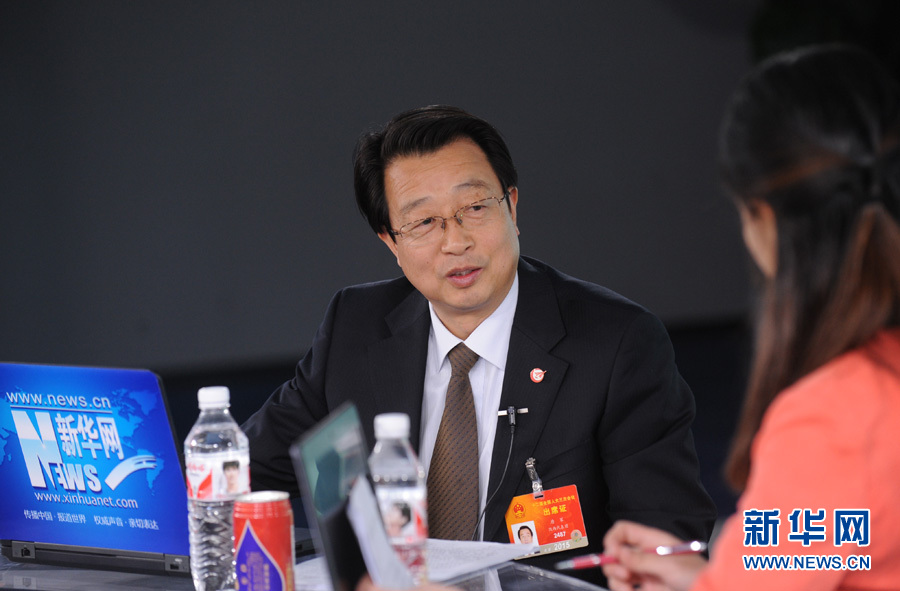 2015年3月13日,全國(guó)人大代表、中航飛機(jī)股份有限公司總經(jīng)理唐軍做客新華網(wǎng),就航空制造業(yè)面臨的機(jī)遇和挑戰(zhàn)與廣大網(wǎng)友展開(kāi)交流。圖為唐軍與主持人交談。 新華網(wǎng) 陳競(jìng)超 攝