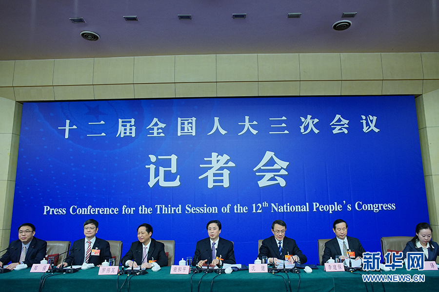 ????3月13日上午10時,十二屆全國人大三次會議新聞中心邀請四川大學校長謝和平、江蘇省教育廳廳長沈健、廣東省教育廳廳長羅偉其、海南大學校長李建保、貴州大學校長鄭強就完善高等教育治理結(jié)構的相關問題回答中外記者提問。圖為出席記者會的嘉賓。新華網(wǎng)/中國政府網(wǎng) 郭小天 攝