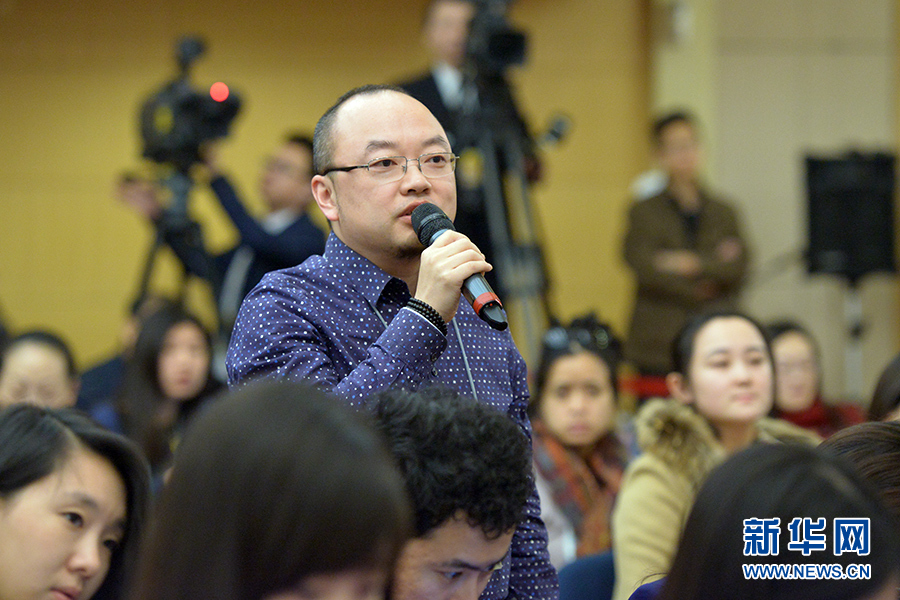 ????3月13日上午10時(shí),十二屆全國(guó)人大三次會(huì)議新聞中心邀請(qǐng)四川大學(xué)校長(zhǎng)謝和平、江蘇省教育廳廳長(zhǎng)沈健、廣東省教育廳廳長(zhǎng)羅偉其、海南大學(xué)校長(zhǎng)李建保、貴州大學(xué)校長(zhǎng)鄭強(qiáng)就完善高等教育治理結(jié)構(gòu)的相關(guān)問(wèn)題回答中外記者提問(wèn)。圖為法制日?qǐng)?bào)、法制網(wǎng)記者提問(wèn)。新華網(wǎng)/中國(guó)政府網(wǎng) 郭小天 攝