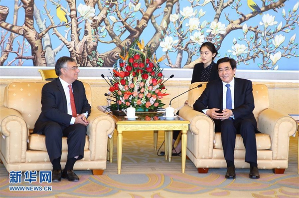 4月14日,中共中央政治局委員、北京市委書記郭金龍在北京會見葡萄牙社會民主黨總書記羅薩。 新華社記者 丁海濤 攝