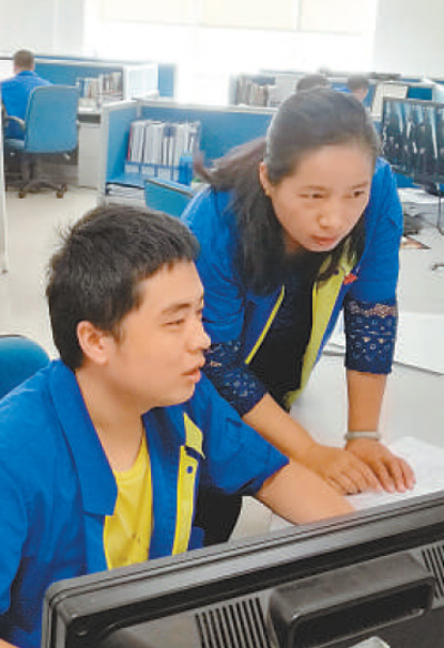姜妍(右)在指導(dǎo)員工修改設(shè)計。本報記者 何 勇攝