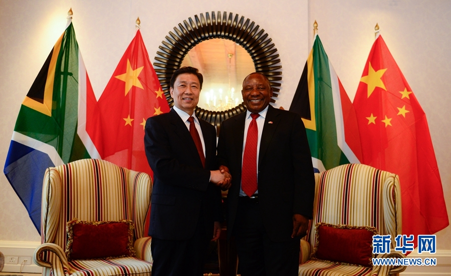 11月22日,在南非開普敦,中國國家副主席李源潮(左)與南非副總統(tǒng)拉馬福薩舉行會(huì)談。 新華社記者翟健嵐攝