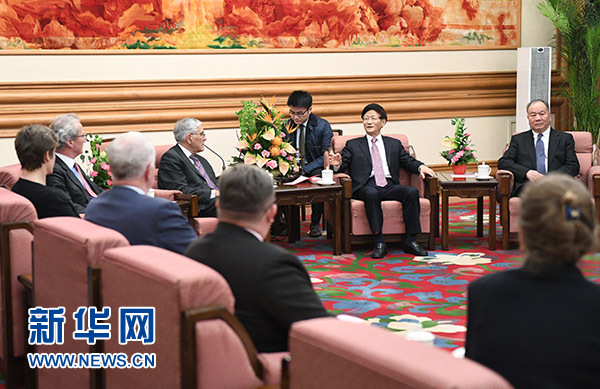 11月25日,中共中央政治局委員、中央政法委書記孟建柱在北京會(huì)見中英法治圓桌會(huì)議英方代表。 新華社記者謝環(huán)馳攝