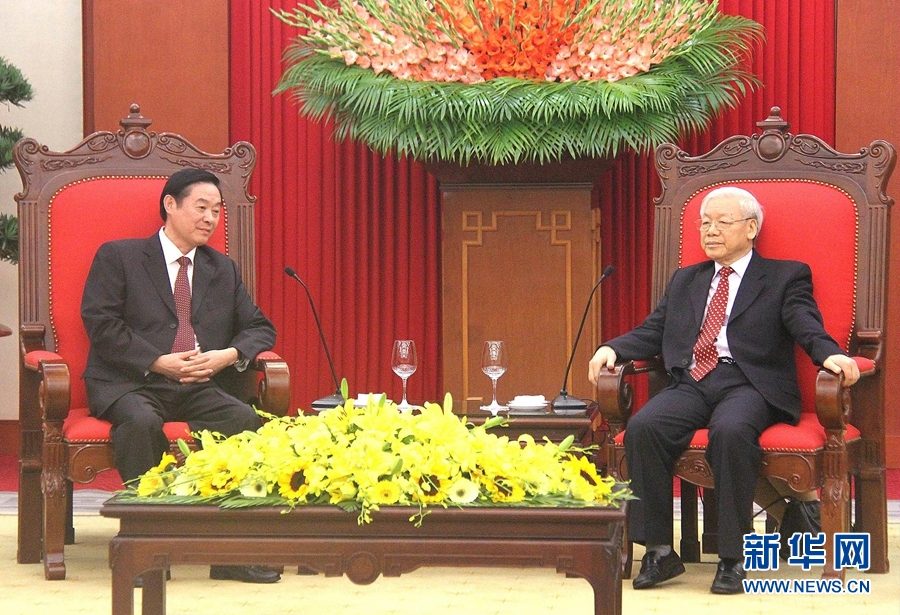 12月22日,越南共產(chǎn)黨中央總書記阮富仲(右)在河內(nèi)會(huì)見率中共代表團(tuán)出席第十二次中越兩黨理論研討會(huì)的中共中央政治局委員、中央書記處書記、中宣部部長劉奇葆。新華社記者樂艷娜攝