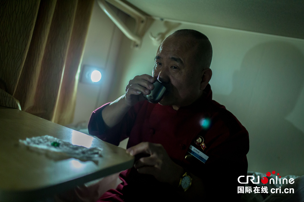 晚上11點(diǎn)多,大部分旅客已進(jìn)入夢(mèng)鄉(xiāng),白振慶師傅終于可以回到休息室稍作調(diào)整,但只能小睡幾個(gè)小時(shí),凌晨4點(diǎn)白師傅還要起來為旅客準(zhǔn)備早飯。白師傅血壓偏高,每天晚上都要吃藥進(jìn)行控制。