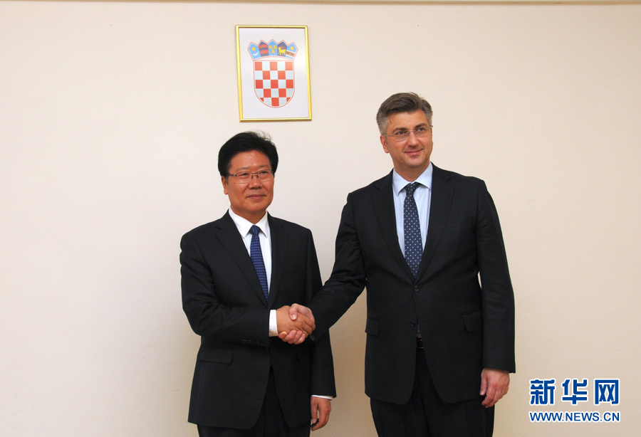 ??? 4月10日,克羅地亞民主共同體主席、政府總理普連科維奇(右)在薩格勒布會(huì)見(jiàn)中共中央政治局委員、中央黨的建設(shè)工作領(lǐng)導(dǎo)小組副組長(zhǎng)張春賢。新華社記者薛群攝