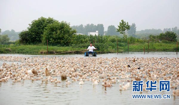 6月14日,在河南省信陽(yáng)市光山縣文殊鄉(xiāng)杜槐村麻鴨養(yǎng)殖基地,甘平安正在放養(yǎng)麻鴨。新華社發(fā)