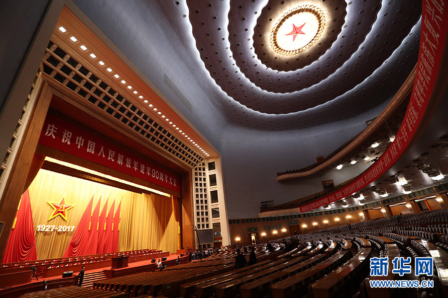 慶祝中國(guó)人民解放軍建軍90周年大會(huì)8月1日在人民大會(huì)堂舉行。圖為大會(huì)現(xiàn)場(chǎng)。新華網(wǎng) 陳杰 攝