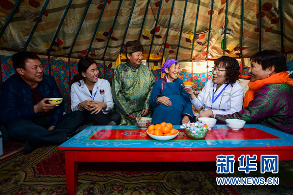 家庭責(zé)任醫(yī)務(wù)人員與阿巴嘎旗牧民道力格爾瑪一家拉家常(2月20日攝)。為緩解牧民看病難問題,從2013年起,阿巴嘎旗給超出衛(wèi)生院服務(wù)半徑10公里的每戶牧民配備小藥箱,安排家庭責(zé)任醫(yī)生,還購買了12臺(tái)內(nèi)置B超機(jī)、心電圖機(jī)、尿液分析儀等醫(yī)療設(shè)備的流動(dòng)服務(wù)車。新華社記者 連振 攝