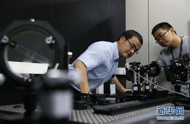 在上海張江國家科學中心,冷用斌(左)和同事在上海光源同步光診斷實驗室內(nèi)做實驗(2015年5月27日攝)。新華社記者 裴鑫 攝