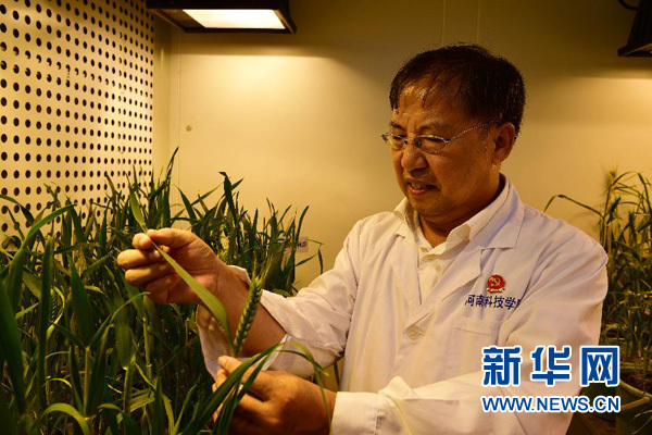 在河南科技學(xué)院小麥研究中心,小麥育種專家茹振鋼在人工氣候?qū)嶒炇也榭葱←滈L勢(9月30日攝)。新華社記者馮大鵬攝