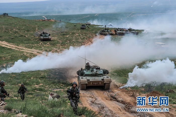 “跨越-2016·朱日和A”演習(xí)進(jìn)入實(shí)兵對(duì)抗陣地進(jìn)攻戰(zhàn),這是紅藍(lán)雙方首場(chǎng)對(duì)抗中紅軍步兵和坦克協(xié)同(2016年7月19日攝)。新華社發(fā)(王佳寅 攝)