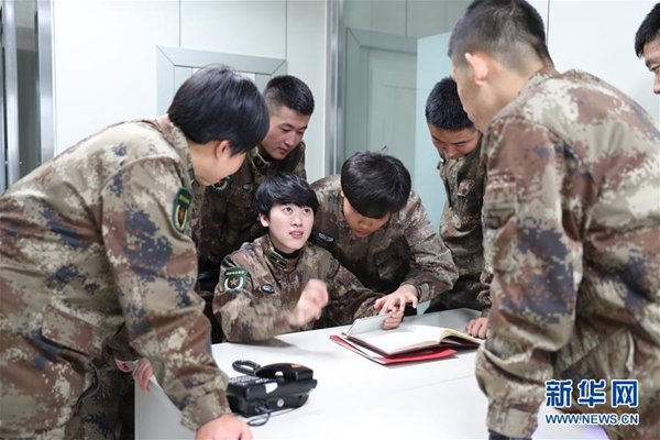 11月2日,黨的十九大代表、吉林省軍區(qū)數(shù)據(jù)信息室助理工程師張燕兵(中)來到吉林省軍區(qū)綜合訓(xùn)練隊宣講十九大精神。新華社發(fā)(屈雷宇攝)