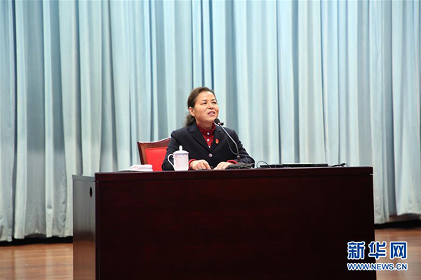 孫金娣組織“貫徹十九大,聽(tīng)總書(shū)記話,永遠(yuǎn)跟黨走”黨員群眾大會(huì),并進(jìn)行宣講(11月10日攝)?!⌒氯A社記者楊紹功攝