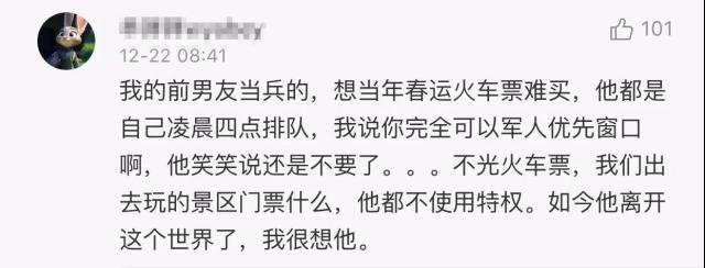 @宇:我去年夏天在蘭州站親眼看見一位被召回的軍官著急買票歸隊,被排隊的人罵沒素質(zhì),售票人員也不給優(yōu)先。最后我就讓他排我前面了。他們?yōu)閲胰嗣窀冻鎏?,愛護軍人,才是愛護自己。