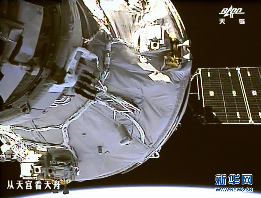 4月22日,北京航天飛行控制中心大廳大屏幕顯示天舟一號(hào)與天宮二號(hào)自動(dòng)交會(huì)對(duì)接畫(huà)面。這是天舟一號(hào)與天宮二號(hào)進(jìn)行的首次自動(dòng)交會(huì)對(duì)接,也是我國(guó)自主研制的貨運(yùn)飛船與空間實(shí)驗(yàn)室的首次交會(huì)對(duì)接。(新華社發(fā)王泗江 攝)