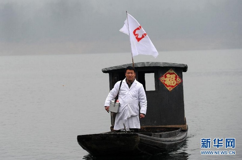海島的東島岸邊,常年??恐粋€(gè)船屋,外面掛著“麻埠鎮(zhèn)齊山村海島衛(wèi)生站”的牌子。39歲的余家軍是船屋的主人,1999年衛(wèi)校畢業(yè)后回到齊山村,和妻子吳起嬌把家安到了船上,取名“海島衛(wèi)生站”,他也成了這里唯一的村醫(yī)。18年里,不論是白天黑夜、刮風(fēng)下雨甚至下雪,余家軍都劃著一條小木船,每日來(lái)往于東西兩島之間,為200多名村民看病,這條木船也被村民們親切地稱為“水上120”。